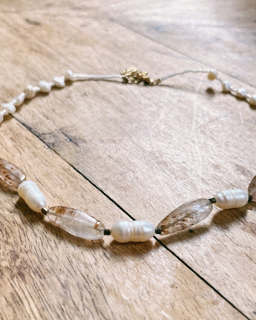 Nous travaillons avec des pierres fines semi-précieuses et des perles d'eau douce pour une touche authentique.