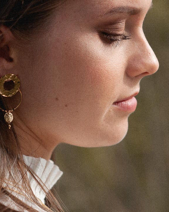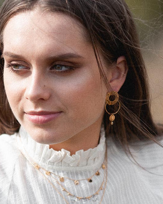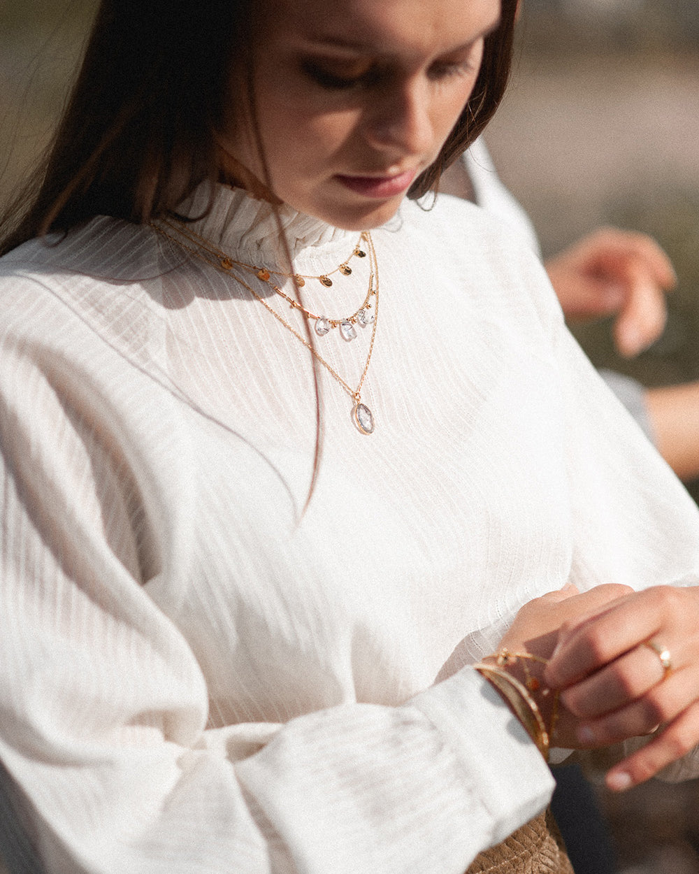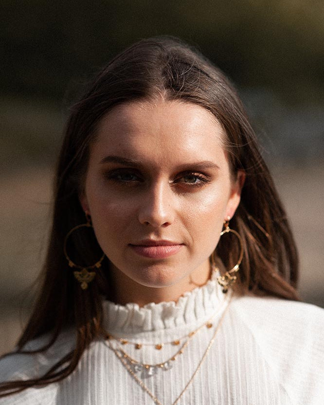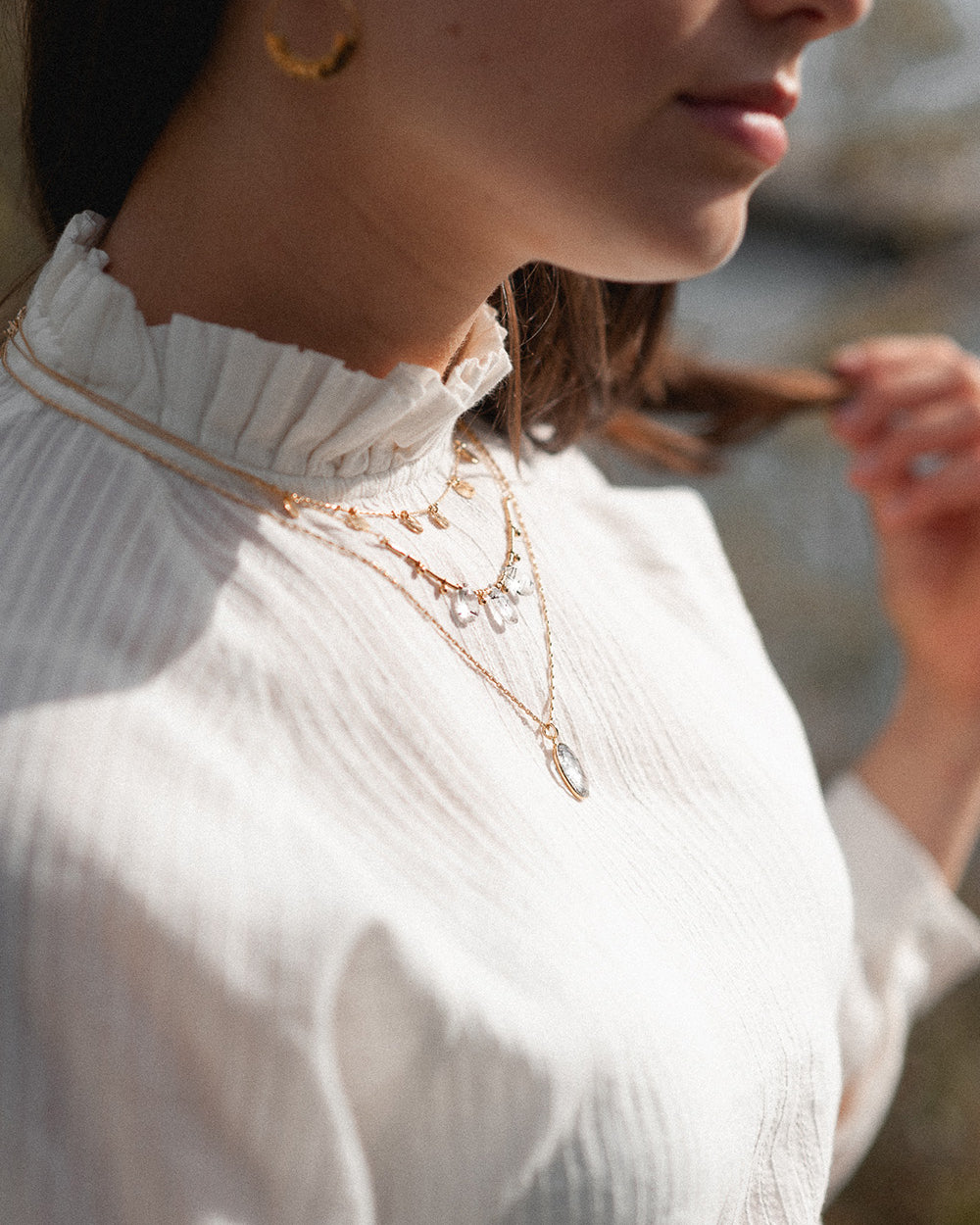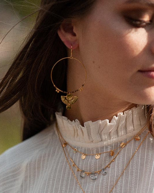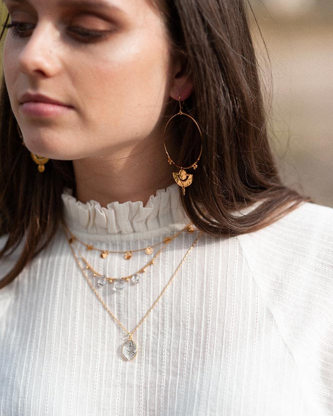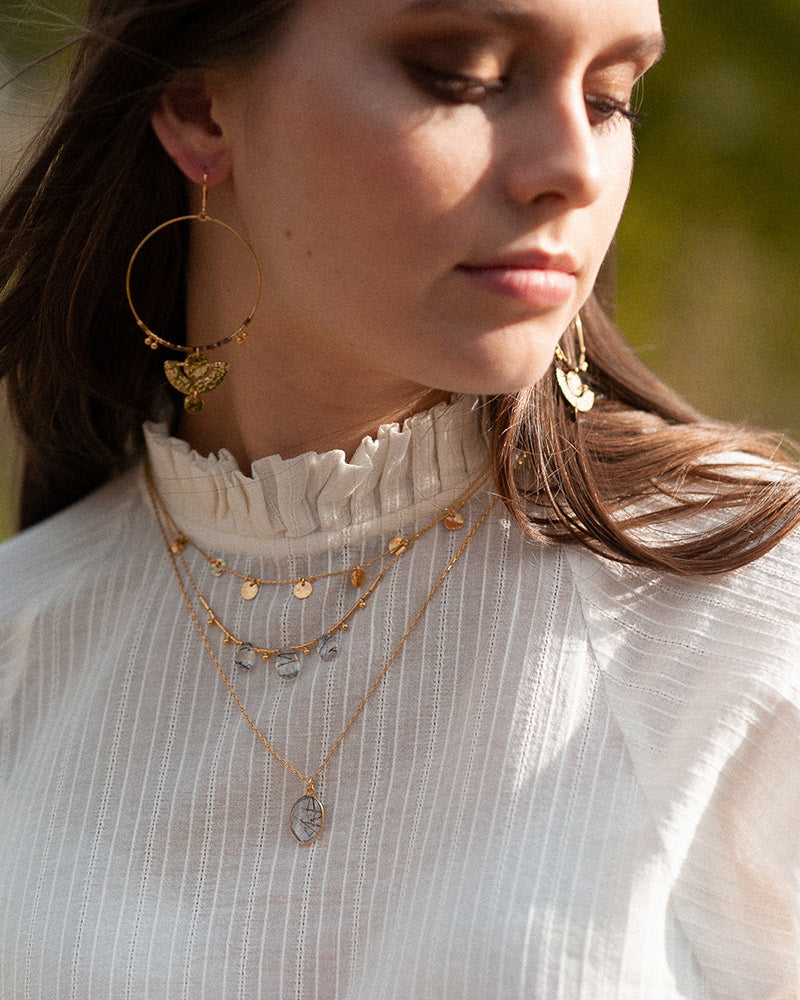 Nos colliers, bagues, boucles d'oreilles et bracelets sont en laiton dorés à l’or fin 24 carats avec une couche allant de 1 à 3 microns pour une tenue longue durée.
