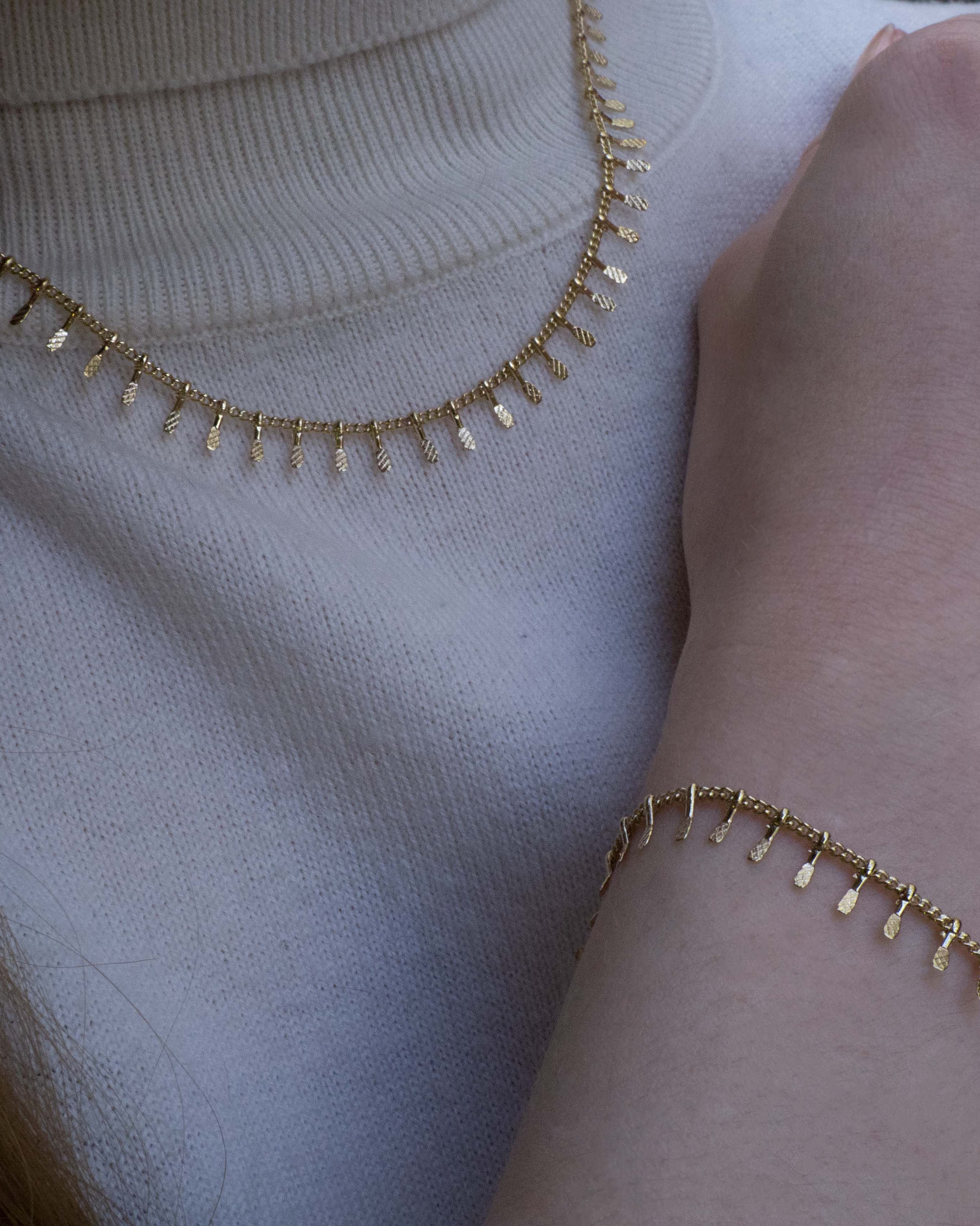 - Minimaliste : Des colliers fins et épurés en argent ou en or blanc ou jaune. Idéal pour une robe sobre et élégante. Les bracelets fins et les bagues discrètes complètent parfaitement un look minimaliste, sans voler la vedette à la mariée.