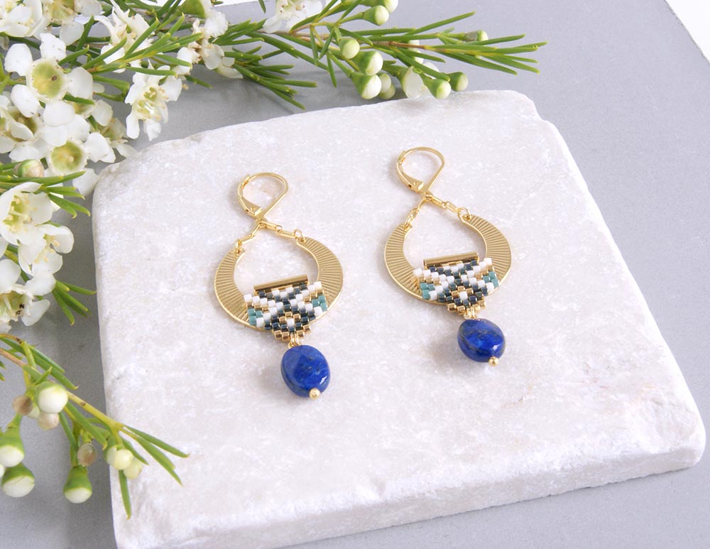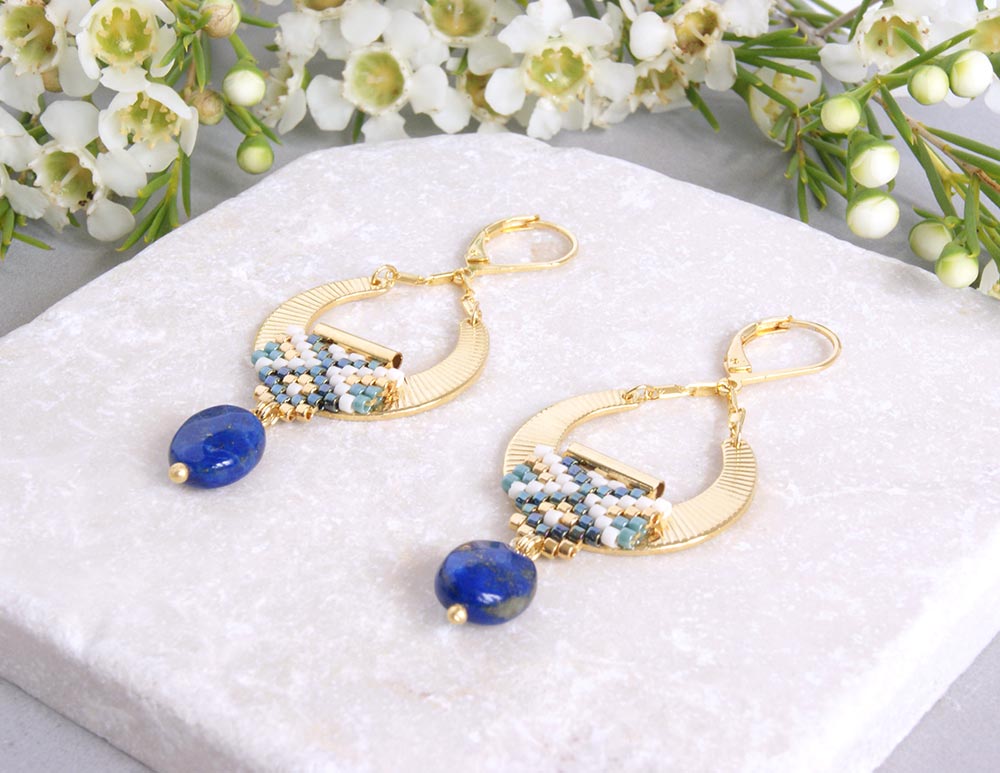 Le bleu intense du Lapis Lazuli associé au tissage de perles japonaises, réalisé à la main, offre aux boucles Kanjari une touche bohème chic assumée.