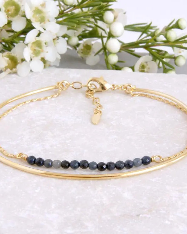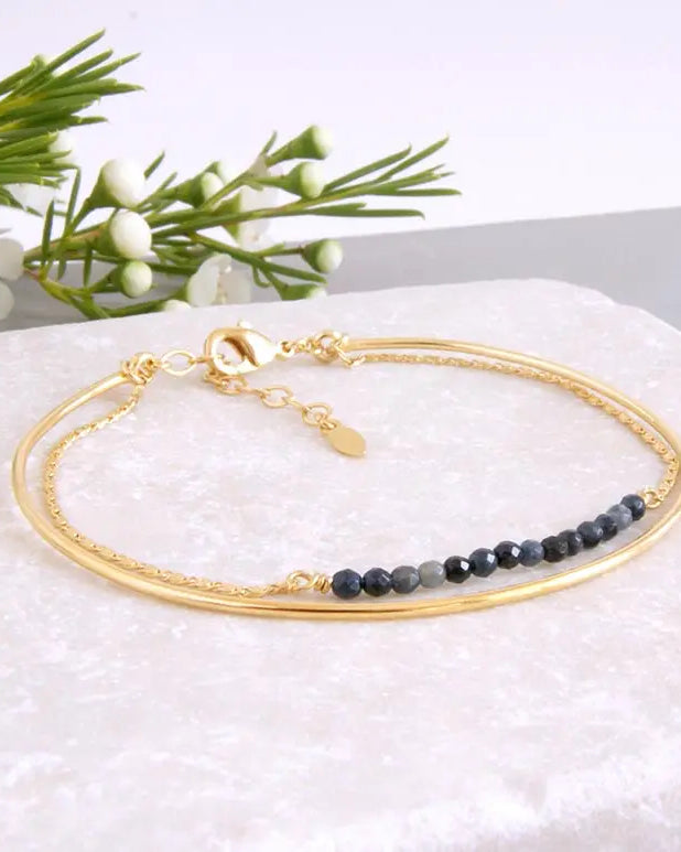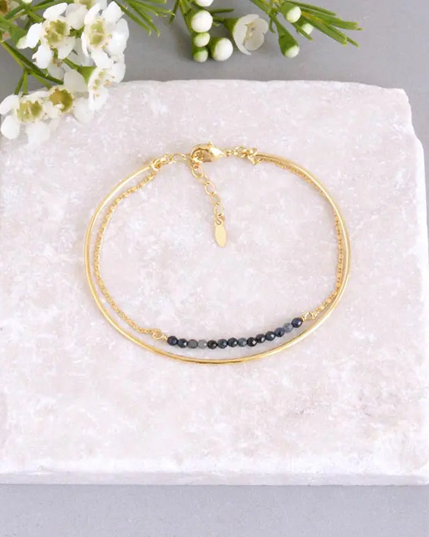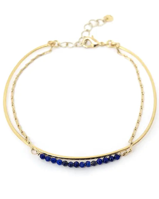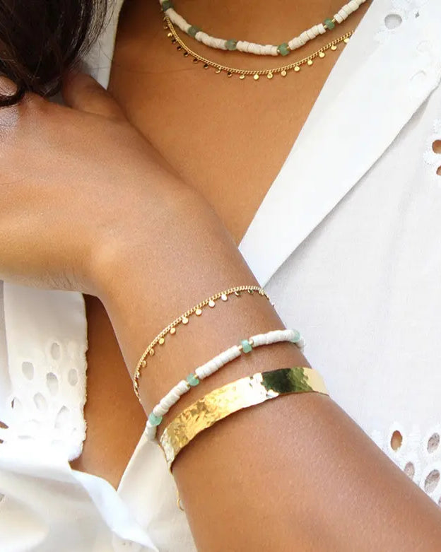 - Bracelet Suna : Jonc fin rigide, martelé à la main. Inspiré par les bracelets bangles indiens portés en accumulation, ce bracelet séduit par sa simplicité et la qualité de son martelage, révélant toute la finesse du bijou. Matériaux : Laiton doré à l'or fin 24 Carats, 3 microns (équivalent du plaqué or).