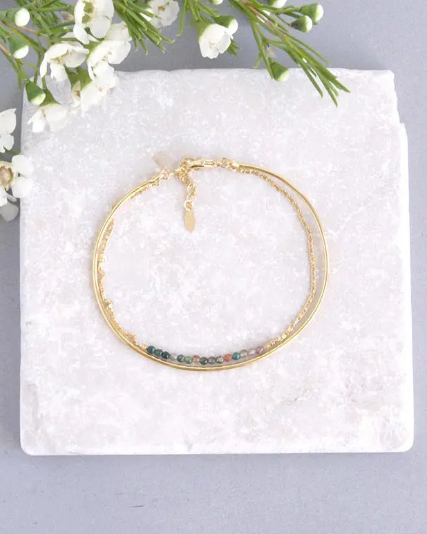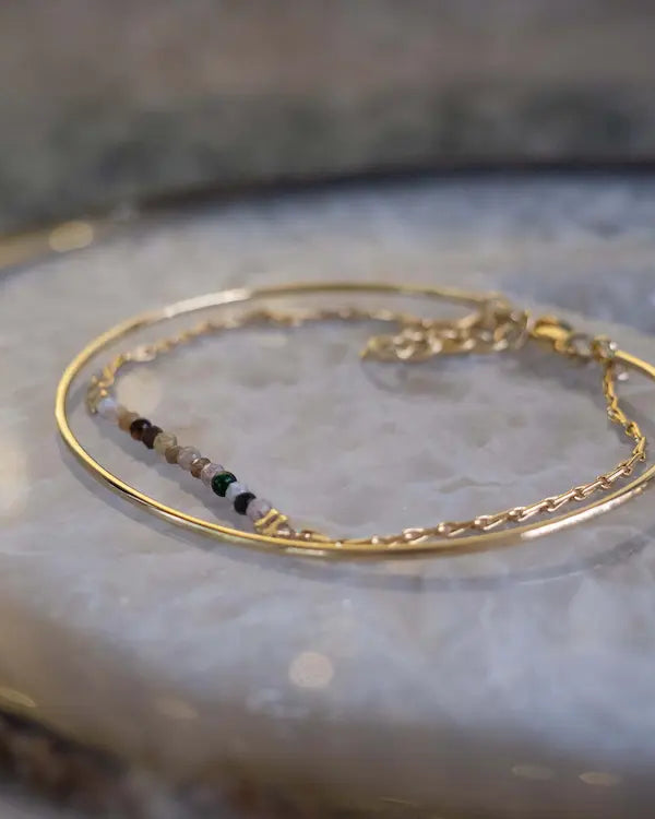 - Associer un jonc fin à une chaîne délicate apporte un contraste harmonieux, tandis que plusieurs joncs dorés de diamètres différents créent un effet bohème et chic.