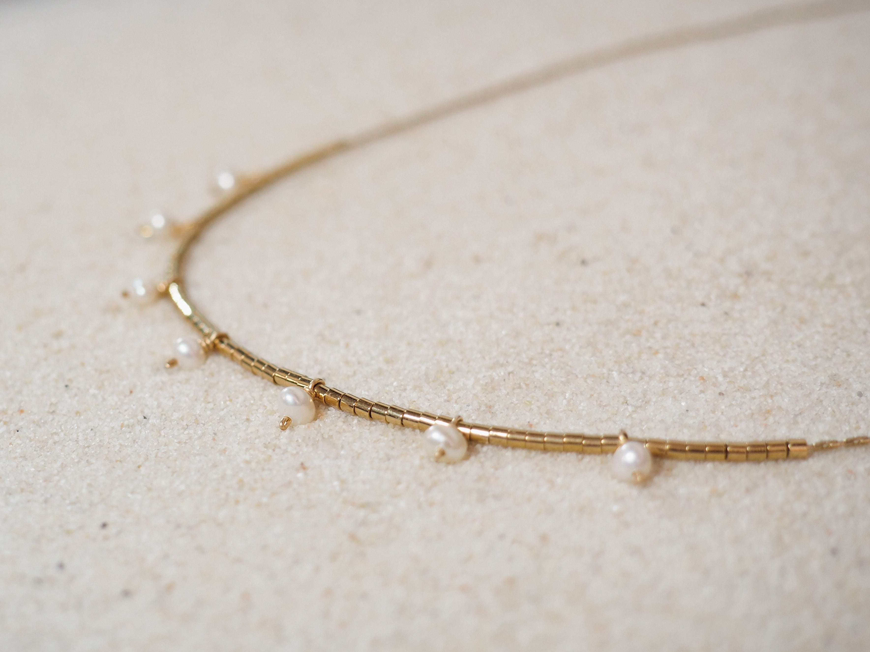 Collier Préa, la délicatesse des perles de nacre, associées à l'or 24 carats. Un collier fin et délicat qui réinvente le traditionnel collier de perles. Un touche de fraîcheur qui agrémentera vos looks les plus simples.