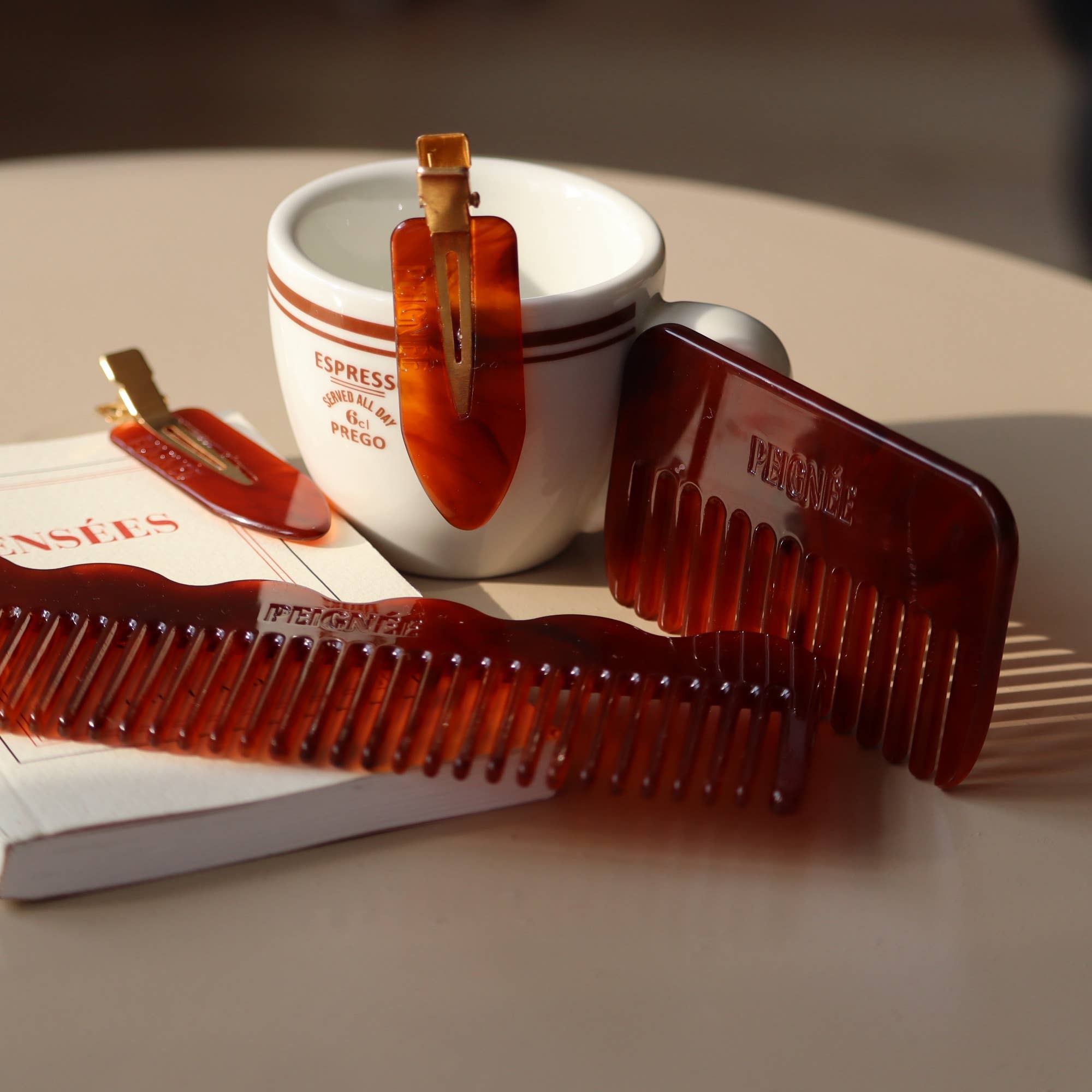 Pour leurs produits, Peigné Paris a choisi de travailler l'acétate de cellulose. Cette matière non issue de la pétrochimie est composée à 70% de fibres végétales. Durable et responsable, elle est biodégradable. Contrairement aux autres peignes du marché, leurs peignes font 4mm d'épaisseur pour leur garantir une résistance parfaite. L'acétate est anti-allergie et respecte le cuir chevelu