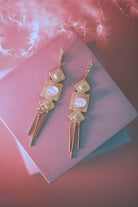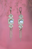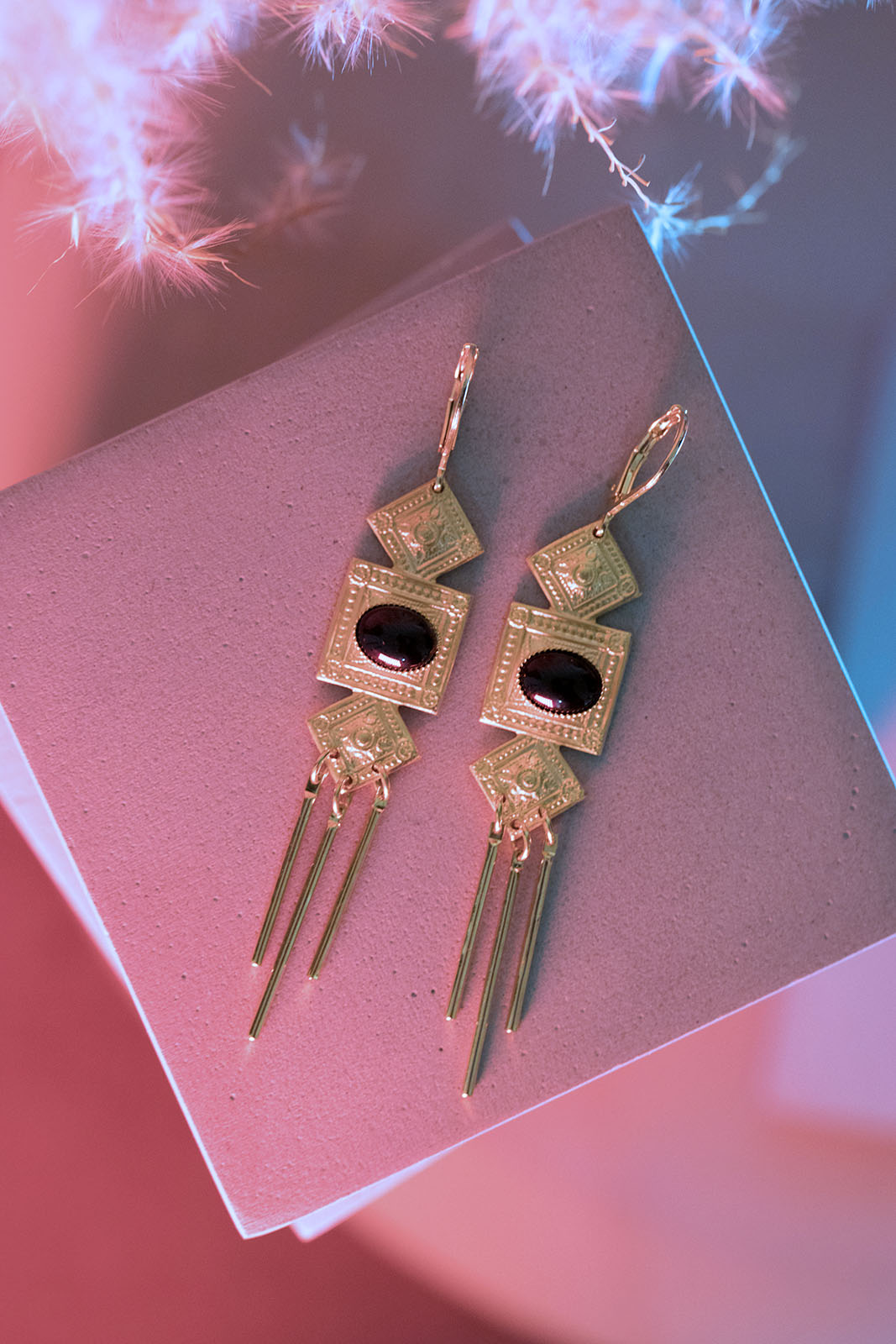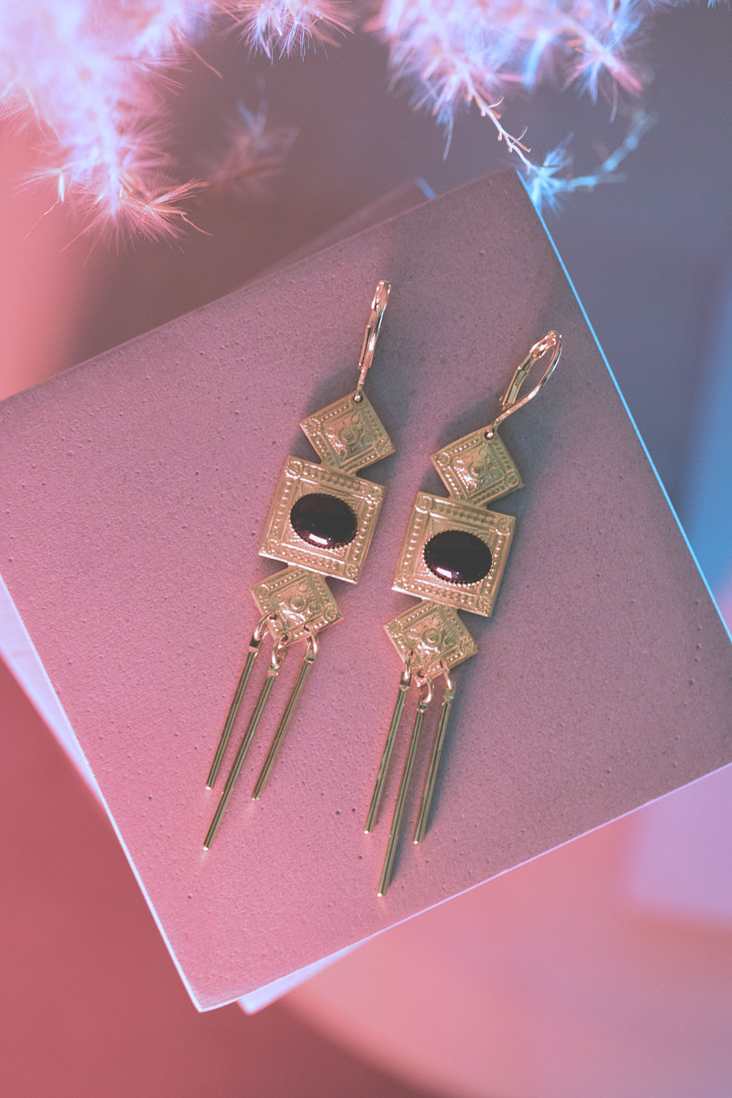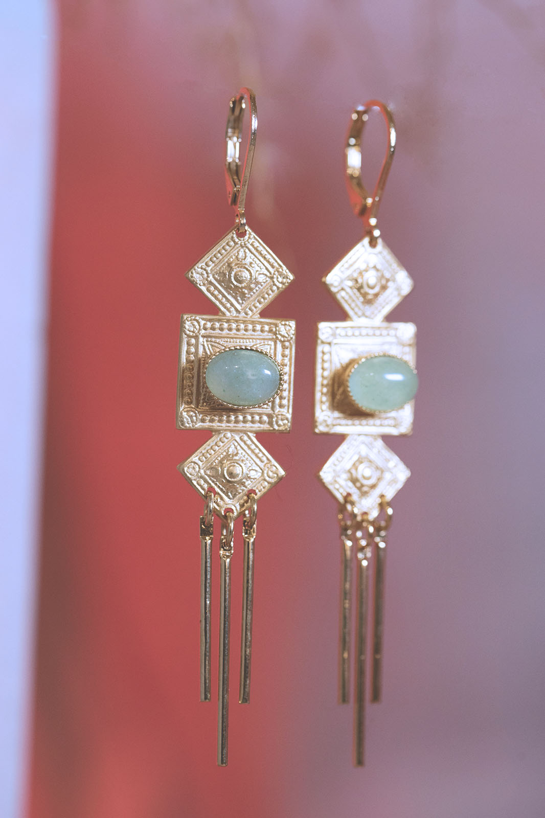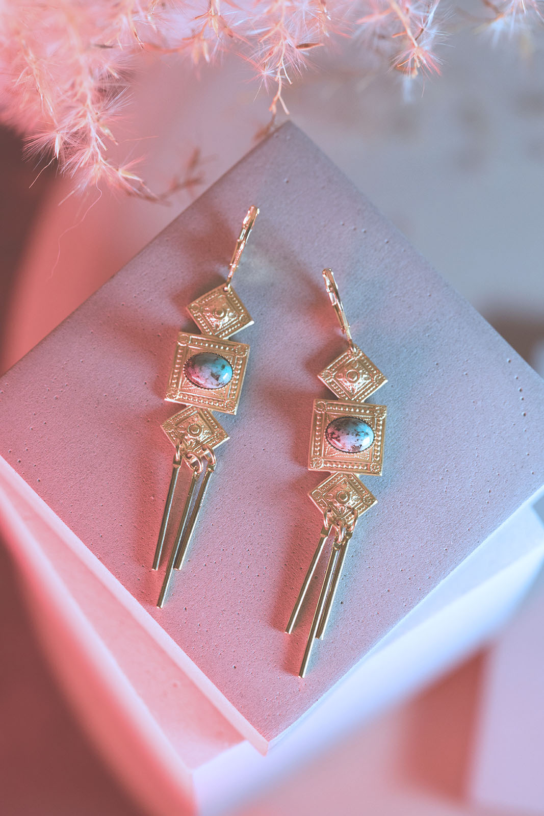 Boucles d'oreilles LOHA, estampes, tubes et pierre cabochon sertie.