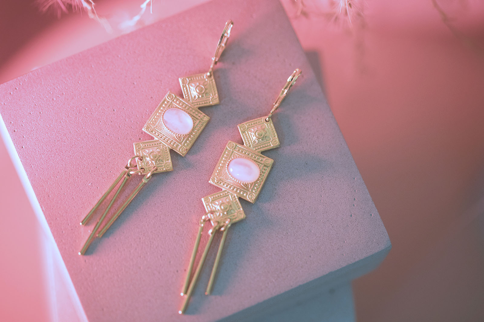 Les apprêts qui composent nos bijoux sont en laiton brut dorés à l’or fin 24 carats un ou trois microns.