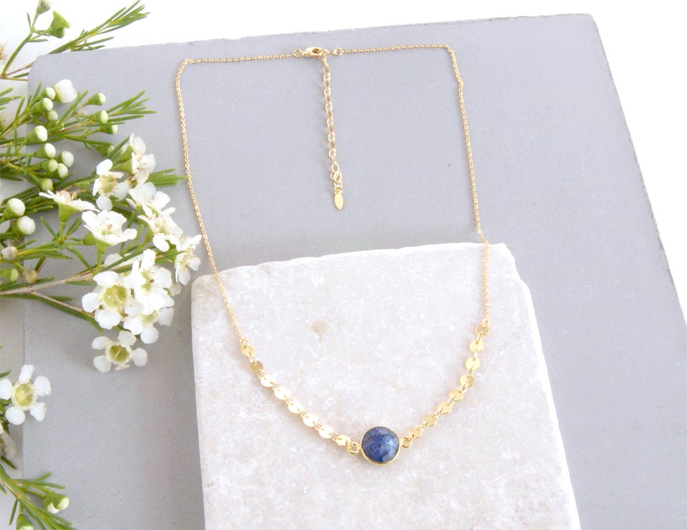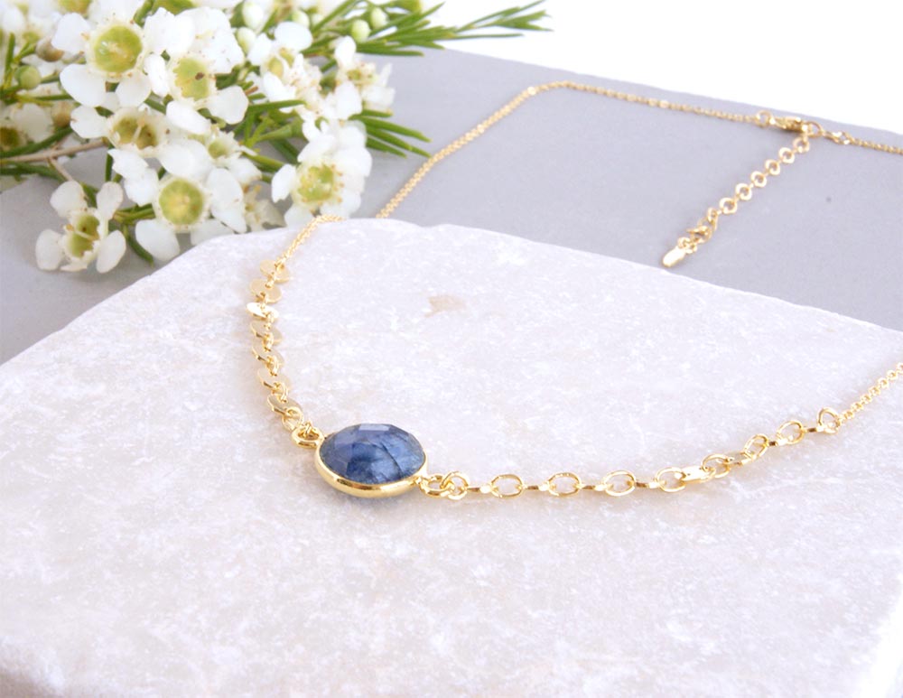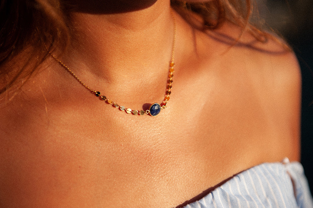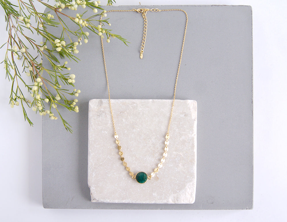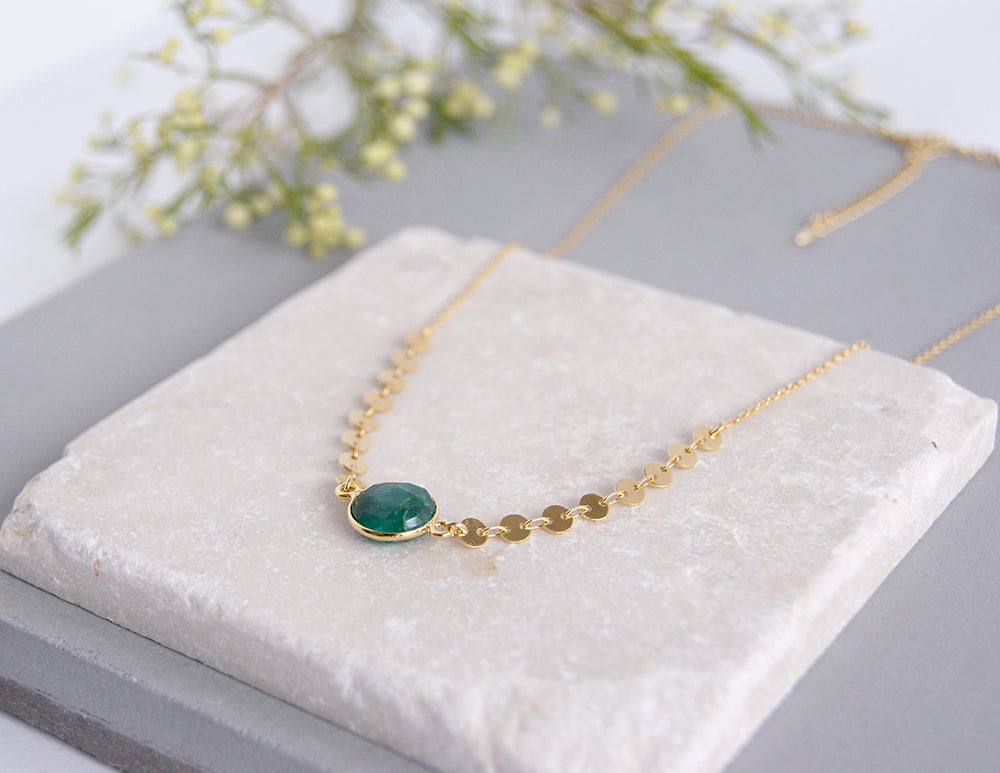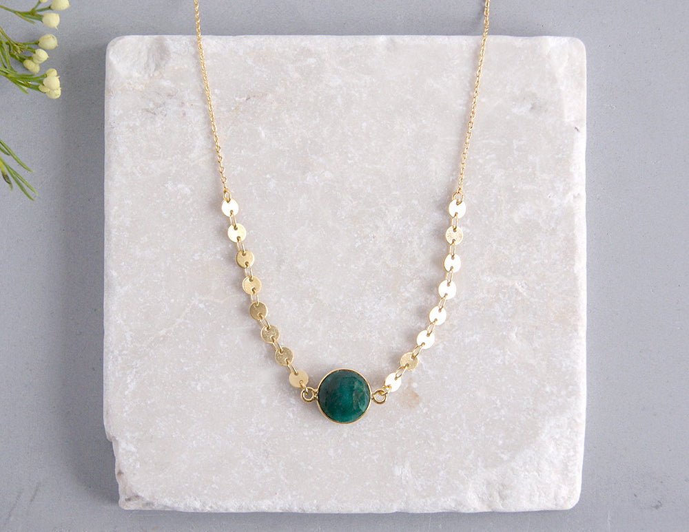 Collier Suvan, un mélange délicat de pierre sertie semi-précieuse émeraude ou saphir et d'une chaine fantaisie dorée. Un de vos bijou favori, pour une touche chic et intemporelle qui sublimera vos tenues du quotidien. Existe également en bracelet disponible ici