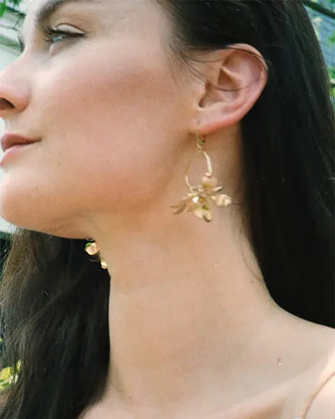 - Laiton doré à l’or fin 24 carats : La dorure appliquée par un expert parisien confère une couleur chaude et éclatante à chaque bijou.